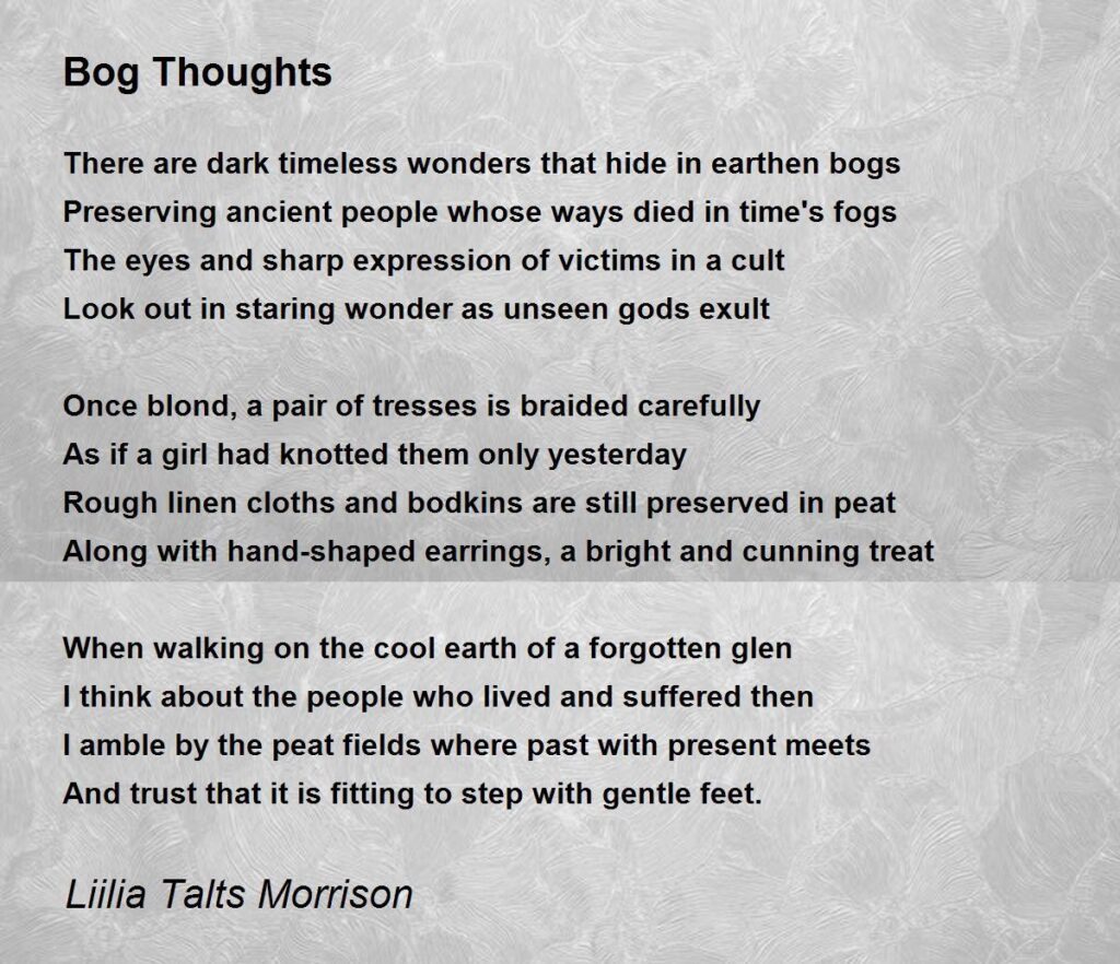 Heaneys beskrivelser af mosen er sanselige og jordnære. Han taler om tørvens tekstur, lugten, den dybde, der gemmer på hemmeligheder. Denne fysiske forbindelse til landskabet gør den historiske og metaforiske betydning endnu stærkere. Læseren trækkes ned i tørvens mørke, kolde greb, og oplever historien på en visceral måde.
